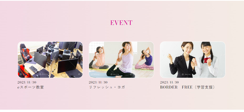イベントページは「カスタム投稿タイプ」で作ったので、イベント一覧にはイベント記事のみ、ブログ一覧にはブログ記事のみが表示されます。