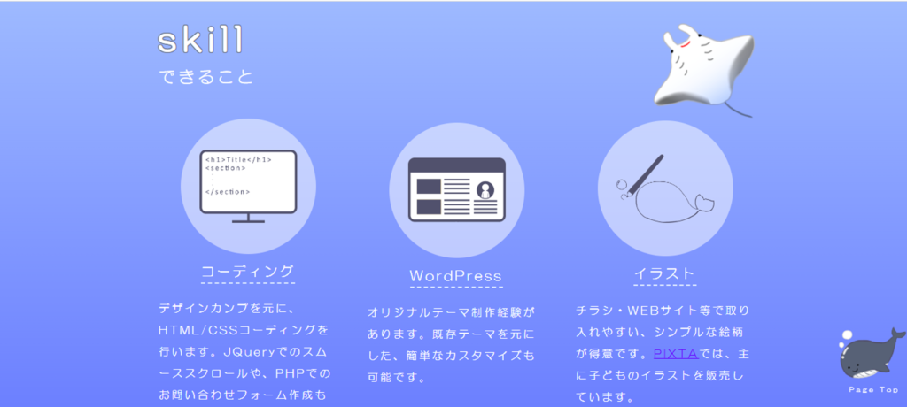 自分が得意なイラストとWEB制作のスキルをかけ合わせて、イラストをいかしたWEBデザインの制作~WEBサイトの構築までお任せいただけるようなWEB制作者になるのが夢です。